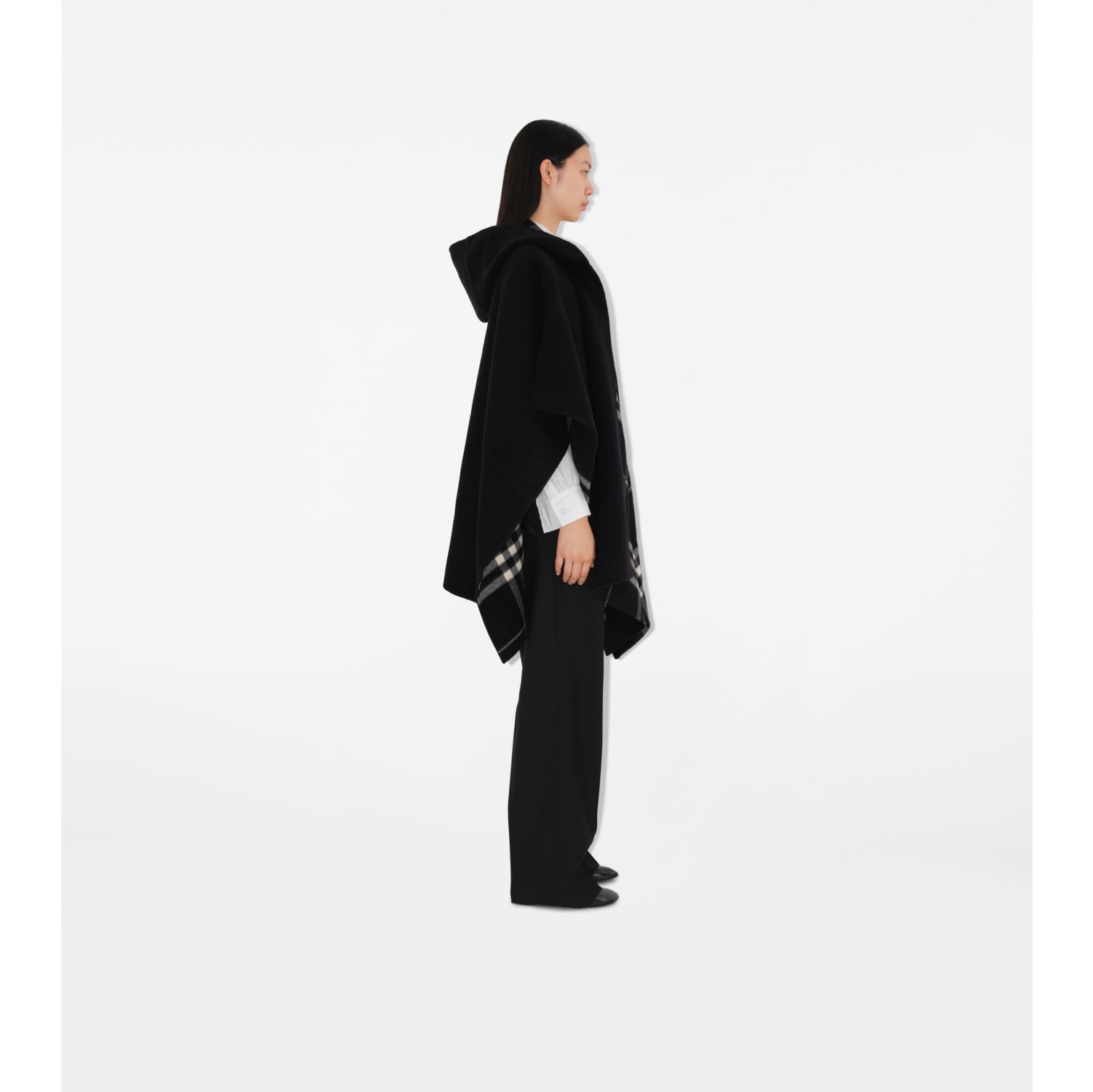 ウーヴンカシミアのイタリア製フーデッドケープ。バーバリーチェックから「馬上の騎士」デザインをエンブロイダリーしたワンカラーに切り替えられるリバーシブル仕様です。着回し力抜群のスタイルが揃うバーバリー クラシックからのアイテム。